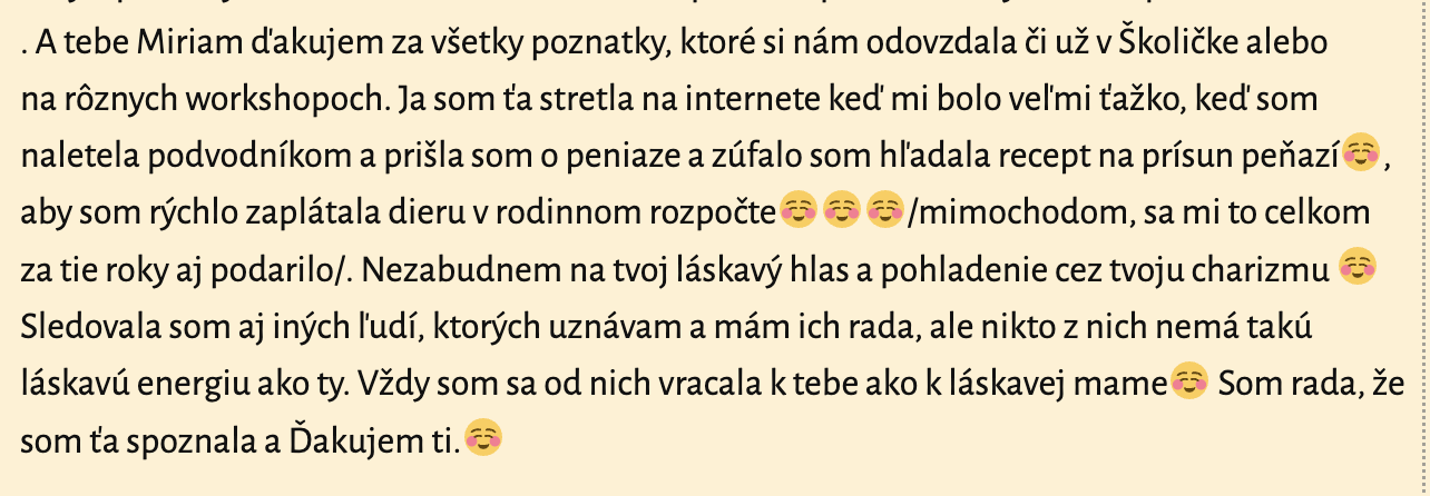 Milá Miriam, škola hojnosti sa stala celý mesiac, pre mňa krásnou súčastou dňa, každé ráno som sa tešila, čo nové ma tam čaká, a tiež mi pripomenula, aké to bolo užasné sa s ňou zobúdzat každý deň, ako som to mala v minulosti. Som ti naozaj vel'mi vdačná za neopakovatel'nú atmosféru spolupatričnosti, lásky a podpory, ktorá tam panuje.