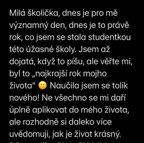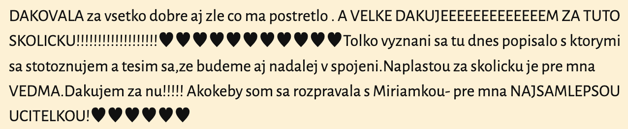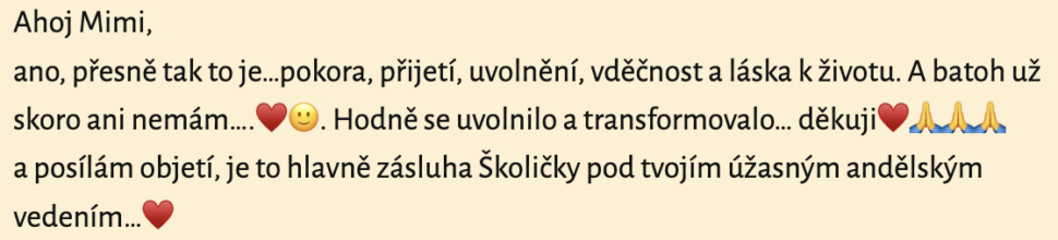 Milí spolužiaci, milá Mirka, ďakujem vám, že vďaka vám sa môžem denne posúvať zas o čosi vyššie. Našla som opäť chuť na sebe pracovať. Našla som spolupatričnosť a súzvuk, nič nie je krajšie, ako podpora, ktorú človek cíti a vie, že v tom nie je sám.
