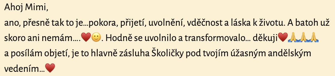 Krásny deň nám dievčatá, začnem tým že: to ako som mohla bez tohoto tú žiť doteraz? A ako môžu tí, čo tu nie sú? Každý deň absolútne super, super, super. Vďaka školičke sa na svet pozerám inými očami. Ďakujem Miriam, aj všetci ostatní. Všetko tu zapadá a dáva zmysel, aj to, že sú tu práve tí ľudia, ktorí sú, ostatní prídu, keď príde ich čas.